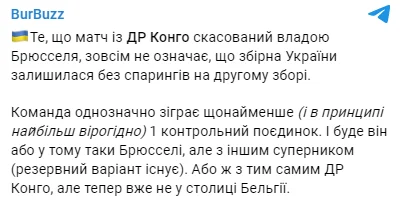 Команда однозначно сыграет по меньшей мере (и в принципе вероятнее всего) один контрольный поединок. И будет он либо в том же Брюсселе, но с другим соперником (резервный вариант существует), либо с тем же ДР Конго, но теперь уже не в столице Бельгии", – написал Бурбас в Telegram-канале BurBuzz.