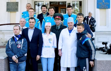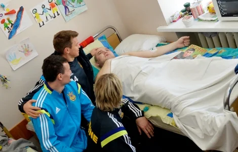 Шесть футболистов - Руслан Ротань, Артем Федецкий, Анатолий Тимощук, Андрей Пятов, Евгений Хачериди и Никита Бурда, а также тренер вратарей Юрий Сивуха - это те сборники, которых национальная команда делегировала в больницу, чтобы выразить слова благодарности нашим героям.