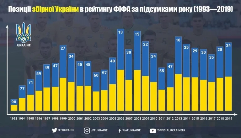 Прошлогодний показатель сборной Украины был на четыре позиции хуже – 28-ая. Главная команда страны демонстрирует стабильность, восьмой раз подряд начиная новый год в топ-50 лучших. Рекорд был зафиксирован в 2006 году, когда сборная Украины под руководством Олега Блохина была на 13-й позиции, а в ежемесячном рейтинге даже была на 11-й позиции (с февраля по май 2007 года).