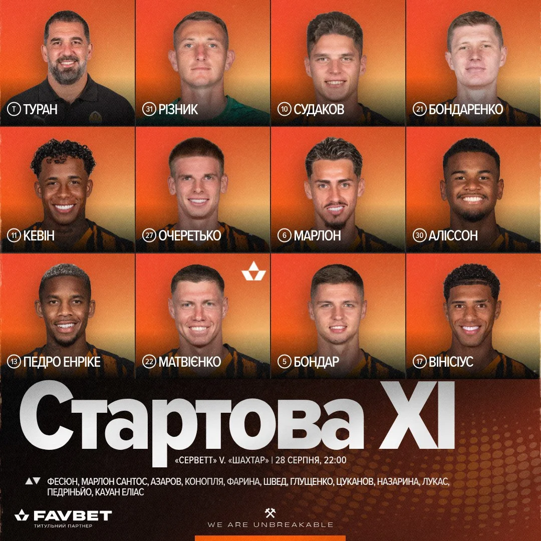 Стартовый состав Шахтера: Ризнык, Винисиус, Бондарь, Матвиенко, Педро Энрике, Марлон, Бондаренко, Очеретько, Алиссон, Кевин, Судаков