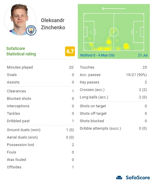 Зинченко вышел добивать Уотфорд, а после выхода украинца команда Гвардиолы забила финальный 4-й гол. Олекс в основном получил лучшие баллы среди резервистов, сыгравших в вечер вторника. Олекс создал 2 момента для удара партнерам, раскрывая зону на фланге и врываясь в штрафную. Отдал 19 точных передач в общей сложности, только дважды ошибившись (здесь лучший вместе с Эдерсоном) и потеряв мяч для команды. Оба его прострела с фланга нашли адресат. А вот с дальними пасами и единоборствами сложилась не очень - ни одной удачной попытки с 3-х.