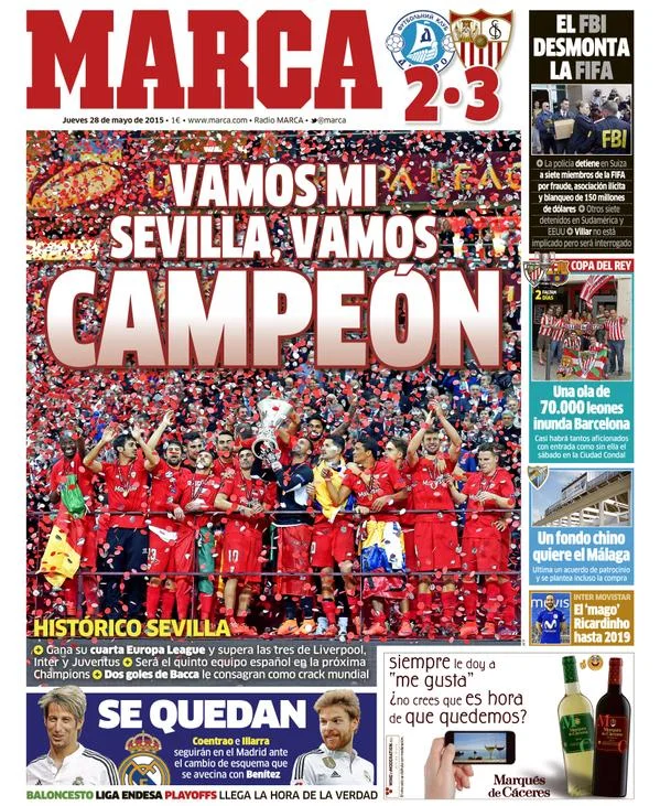 "Легендарная "Севилья", - пишет AS и, как и Marca, отмечает рекордный для "рохибланкос" кубок УЕФА-ЛЕ. Также на титульном листе приводятся слова наставника "Севильи" Унаи Эмери, который призывает сполна насладиться этим триумфальным моментом и отмечает, что счастлив тренировать такой великий клуб, развеяв таким образом слухи о своем возможном уходе. Конечно, о пяти испанских клубах в ЛЧ AS также не забыл: "Только бы "Валенсия" прошла квалификацию!".