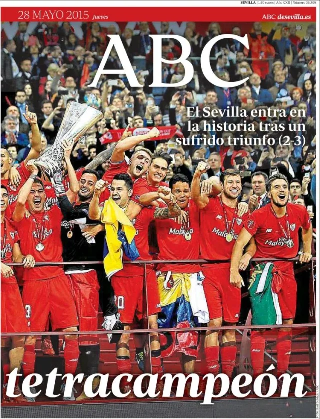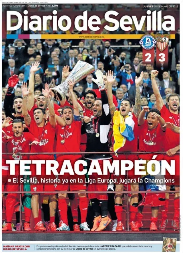 "Тетракампеонам! ЛЕ - это уже история, впереди ЛЧ", - отчитывается Diario de Sevilla. Андалусийское издание отмечает, что, несмотря на эйфорию, руководителям клуба стоит изрядно потрудиться, чтобы Эмери остался на следующий сезон. Интересно, что DDS ставит под сомнение титул лучшего игрока финала, который достался Банеге. По мнению издания, MVP однозначно стал Бакка, который забил два гола и сделал результативную передачу.