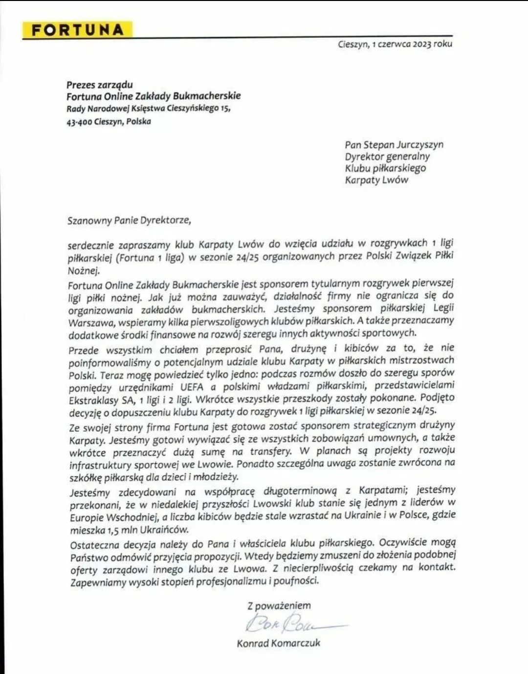 Документ был датирован 1 июня 2023 года и подписан якобы лично президентом Fortuna 1 Конрадом Комарчуком. Как оказалось впоследствии, приглашение и подпись были сфальсифицированы. "Опубликованное письмо сфабриковано, содержит фальшивую подпись и не имеет ничего общего с фактами. Мы никогда не делали предложения о вступлении и спонсорстве Карпатам. Лига примет соответствующие судебные меры", – написал руководитель в Твиттер.