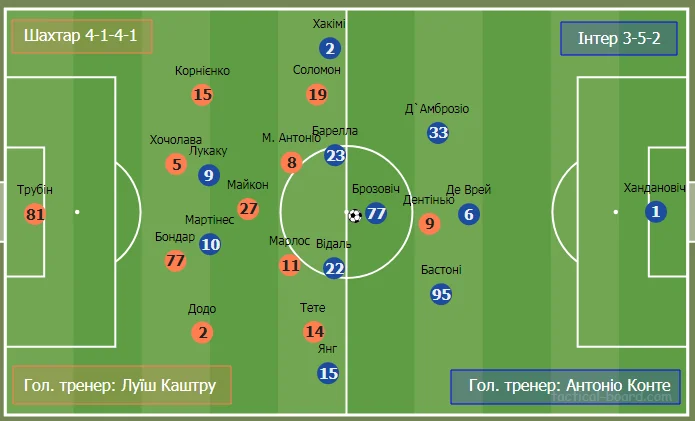 Команди зіграли за звичних базових схем. Шахтар будував гру, тримаючись структури 4-1-4-1 (4-3-3 з м'ячем), а Інтер грав за своєю фірмовою формацією 3-5-2, або 5-3-2, кому як більше подобається.