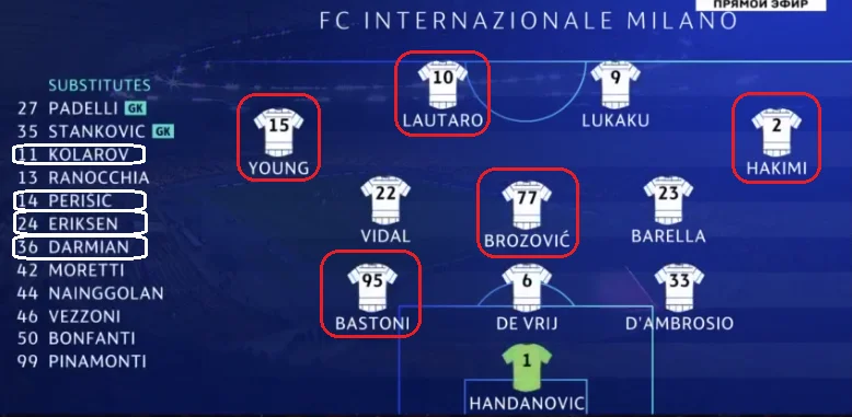 Інколи Д'Амброзіо з Хакімі мінялися позиціями, але структура зберігалася. При цьому Інтер продовжував грати у три центральні захисники. На місце правого центрального зміщувався опорник Брозовіч.