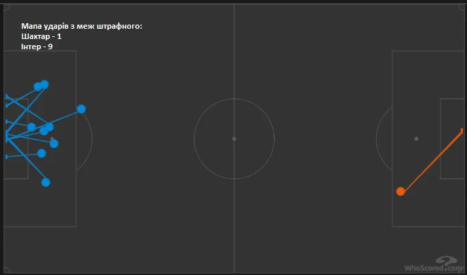Це мапа ударів по воротах. За цими важливими діями рахунок 12:4 на користь гостей. Та 3 дальні постріли Шахтаря не повинні ввести в оману. "Помаранчево-чорні" завдали лише одного удару з меж штрафного.