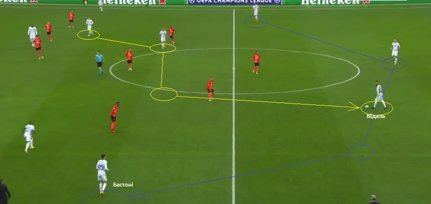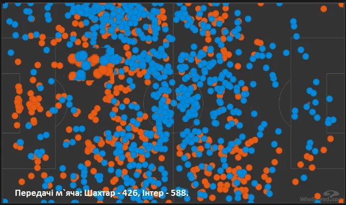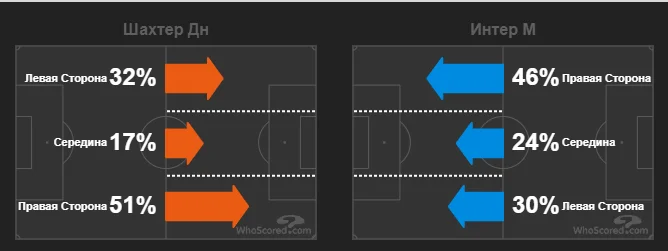 Інтер будував свою гру у позиційному наступі саме через цей напрямок. З трьох вертикальних зон 47% атак гостей проходили саме правим флангом та півфлангом. Шахтар намагався відповідати через зону діяльності Тете і Додо.