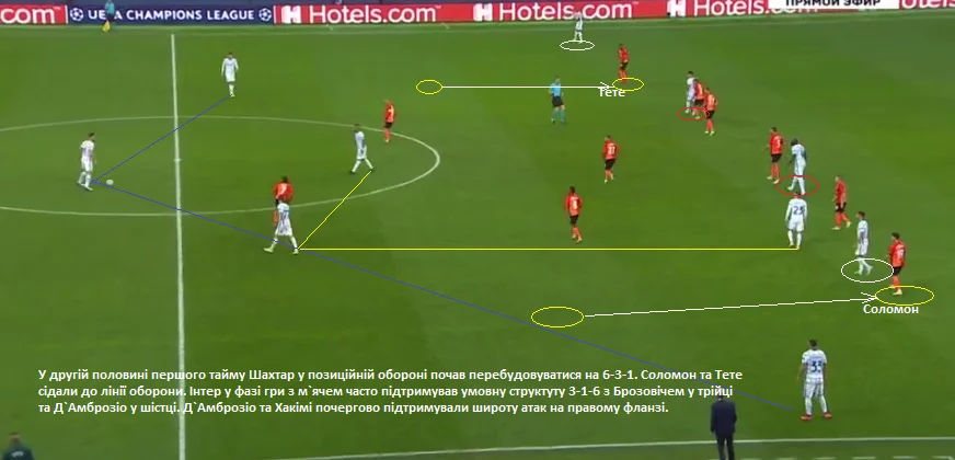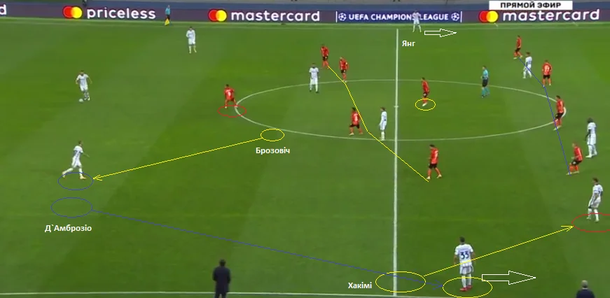 Команда Конте завжди починала атаку розіграшем від своїх воріт. Шахтар за традицією не використовував високого пресингу. Коли італійці переходили у другу третину поля, правий вінгер Хакімі зміщувався у ближній півпростір, а на його позицію підіймався центральний правий захисник Д'Амброзіо, який має чудові навички флангового гравця. Саме він із Янгом відповідали за ширину атак.