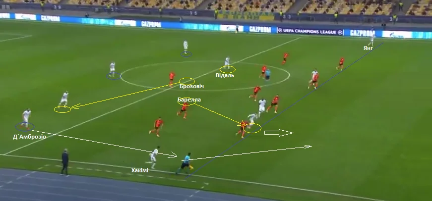 Якщо Д'Амброзіо не йшов уперед, на бровці попереду залишався Хакімі, а у півфланг пересувався Барелла. Конте усвідомлено навантажував правий фланг та півпростір. Хакімі, Барелла та Д'Амброзіо створювали трикутник, до якого постійно зміщувалися Брозовіч та Лукаку.
