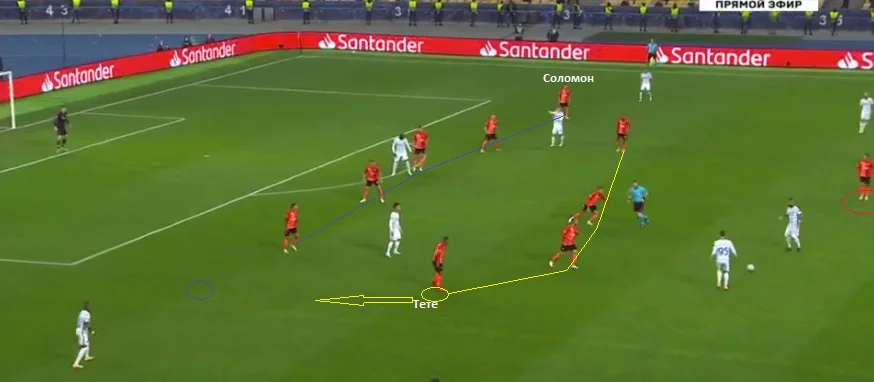 Як і у матчі з Реалом, команда Каштру чудово діяла у позиційній обороні. У середньому блоці Шахтар зустрічав суперника формацією 4-1-4-1. Коли м'яч підходив ближче до фінальної третини поля, Соломон сідав на позицію флангового захисника і Шахтар переходив на гру за схемою 5-4-1. Наступним кроком було зміщення Тете.