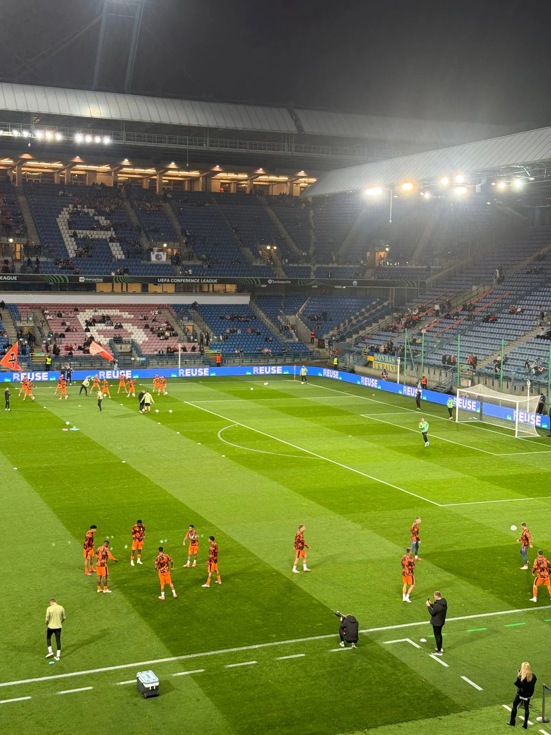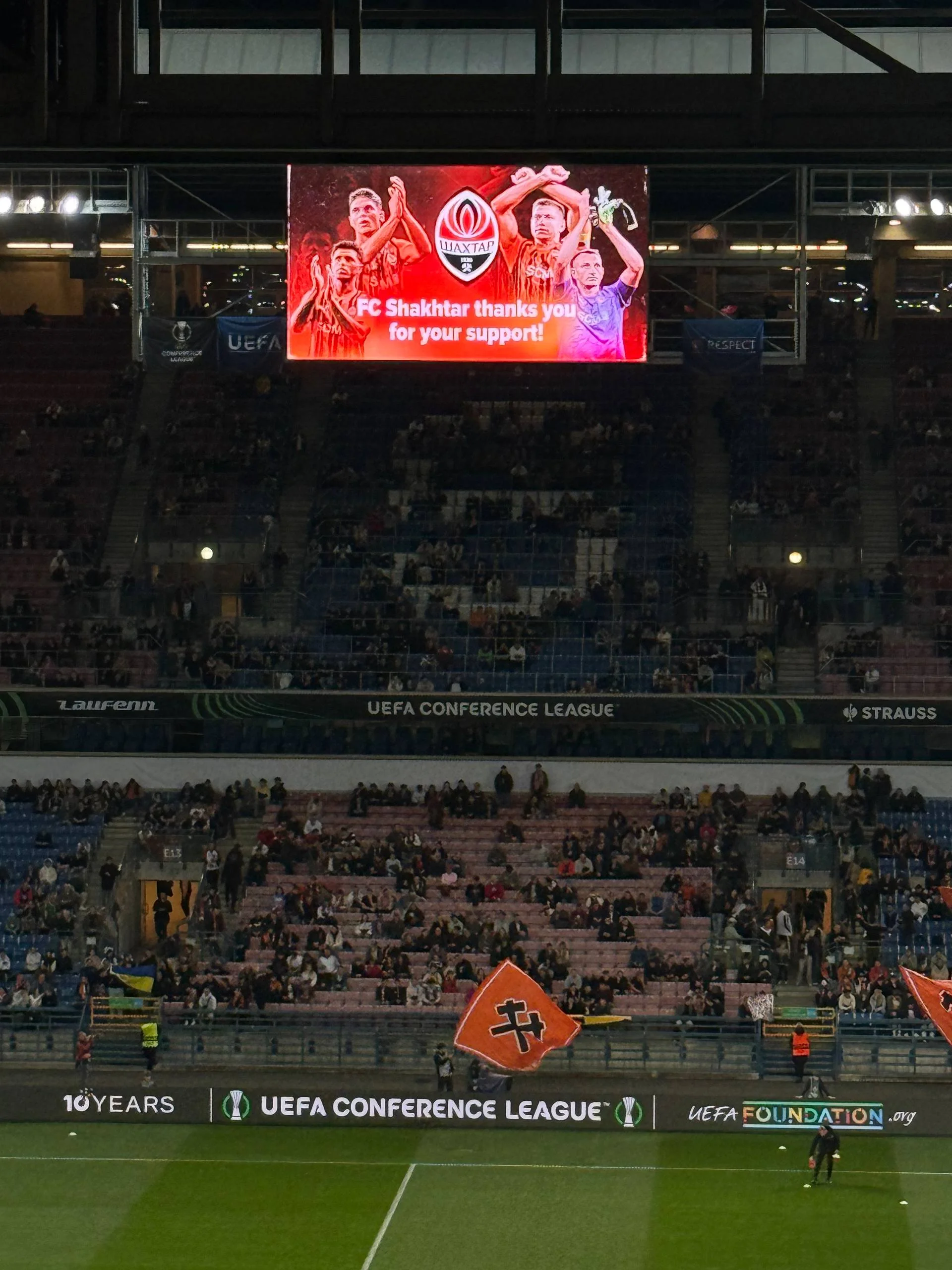 Під час розминки Шахтар не зустрічали оваціями – лише кілька розсіяних оплесків і поодинокі вигуки українською. Українських уболівальників цього вечора було помітно більше – переважна частина стадіону підтримувала саме Шахтар. Проте це була здебільшого тиха підтримка: без фанатських кричалок, із мінімальною кількістю банерів – переважно прапори. На одному із секторів зібралася невелика група ультрас донецької команди, але вона губилася серед решти глядачів.