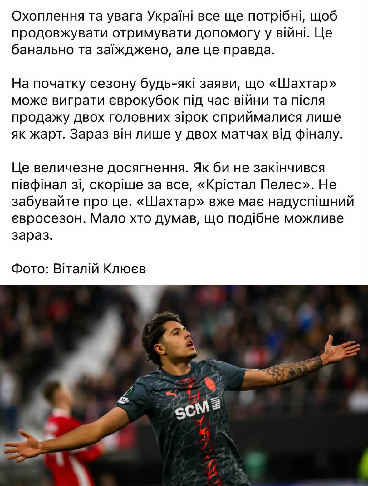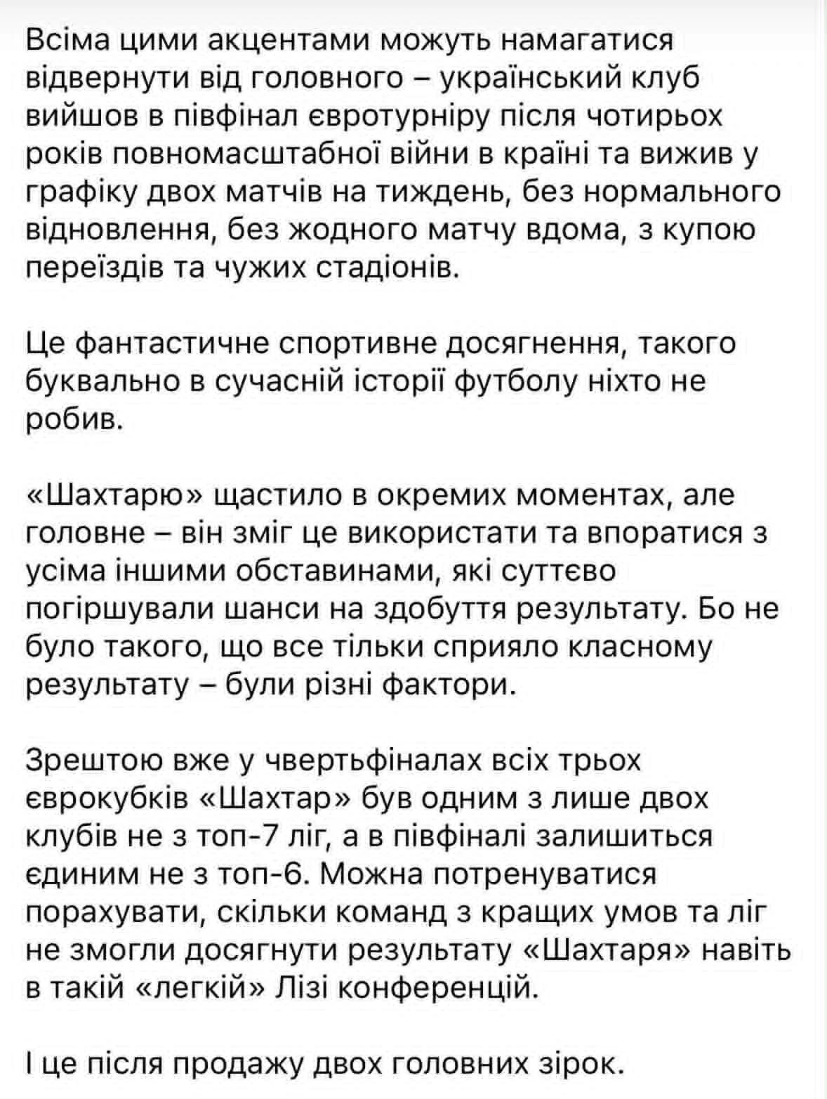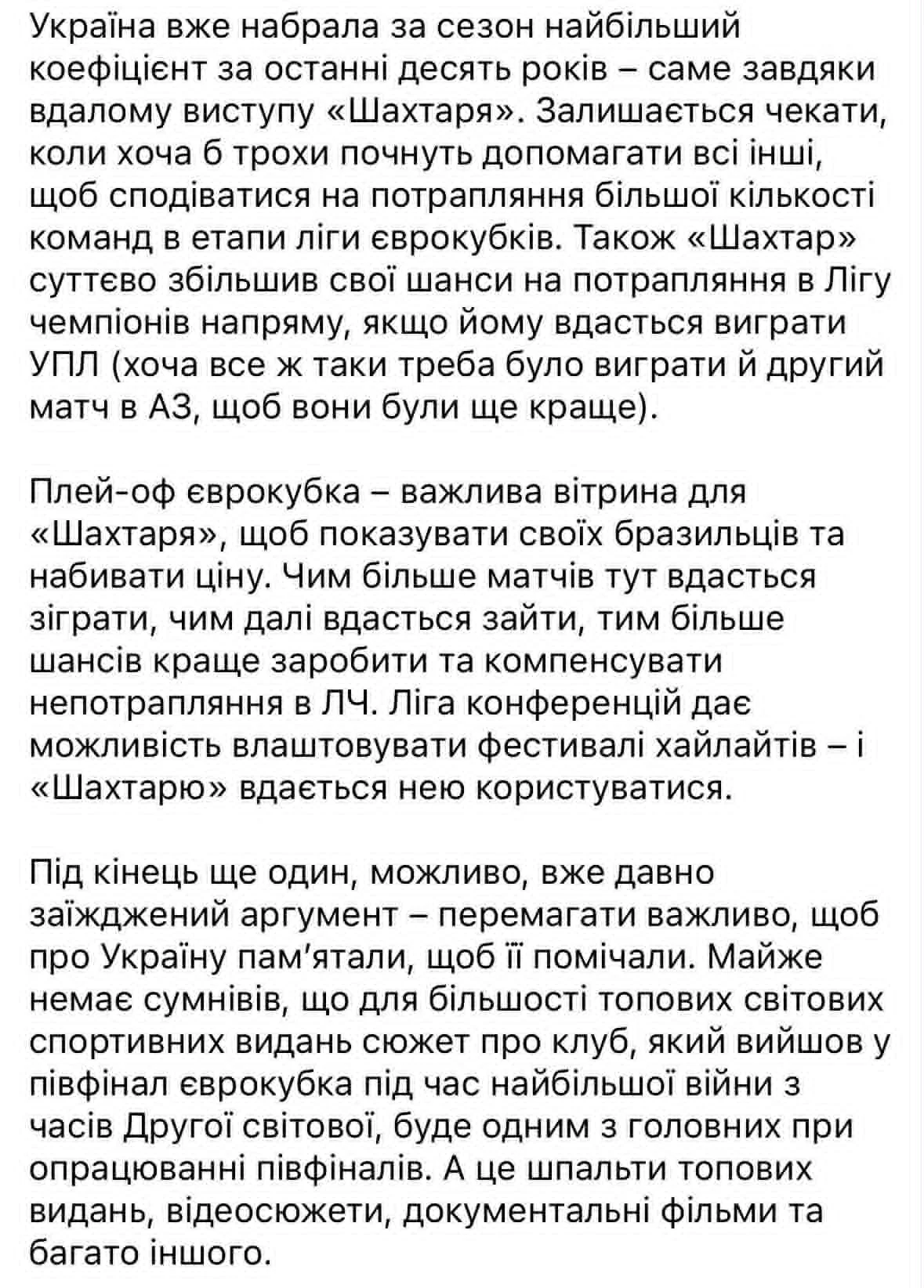 Ось так непомітно Шахтар опинився вже у четвірці найкращих клубів євротурніру. Нехай і найменш престижного із трьох, але це не має великого значення. Адже досягнуто двох стратегічних цілей: "гірники" знову підсвітили своїх чергових талантів для європейського ринку, а також зацікавили світові медіа. До вирішальних раундів дійшов клуб із країни, розбитої чотирма роками найстрашнішої війни континенту з часів Другої світової. Це – безпрецедентно, і це той сюжет, який з апетитом підхоплять топові пабліки.