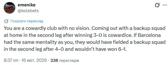 "Ви – клуб боягузів без жодного бачення. Вийти резервним складом вдома після поразки 0:3 – це боягузтво. Якби у Барселони був такий менталітет, як у вас, вона б виставила запасних після 0:4 і не виграла 6:1".