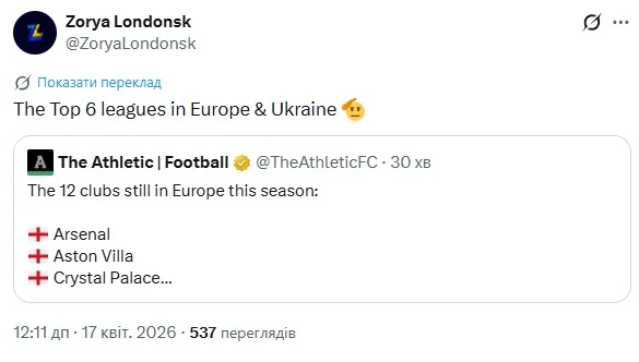Ендрю Тодос, Zorya Londonsk, радіє: "Топ-6 ліг Європи і Україна". Справді, до трьох півфіналів ЛЧ, ЛЄ та ЛК дійшли 4 клуби АПЛ, по 2 представники Ла Ліги, Бундесліги та Ліги 1, по одній команді з Португалії та України. Зауважте – ніякої Серії А! Воістину темні часи переживає італійський футбол.
