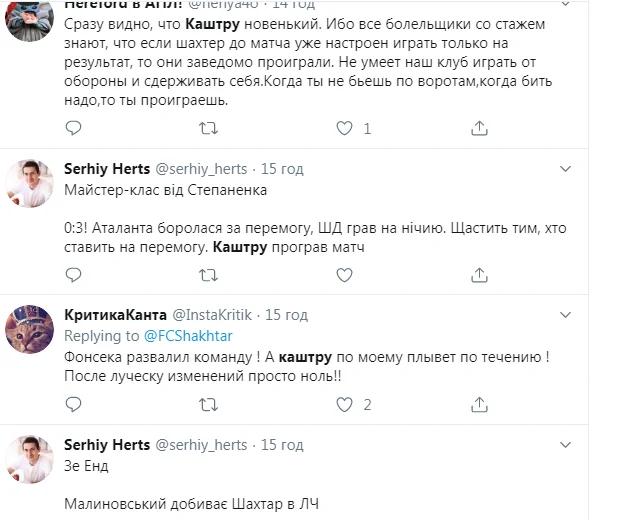 Вболівальники вважають, що грати за рахунком було великою помилкою тренера Шахтаря. Фонсека і Каштру розчаровують, а особливих змін після Луческу нема?