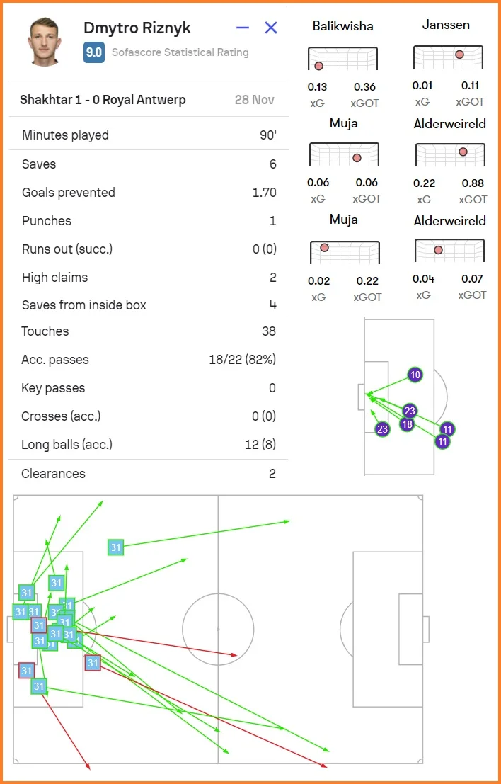 Ризнык стабильно спасал Шахтер после сложных ударов Муи и Баликвиши. Антверпен наиграл на гол, но Дмитрий уберег от 1,7 пропущенного гола в соответствии с системой xGOT. Восхищают даже не столько сейвы на линии, как уверенная игра на выходах. Голкипер "горняков" очень круто перехватывал мячи в партере и контролировал воздух. И не стоит забывать о помощи команде в выходе из обороны (8 из 12 точных дальних передач).