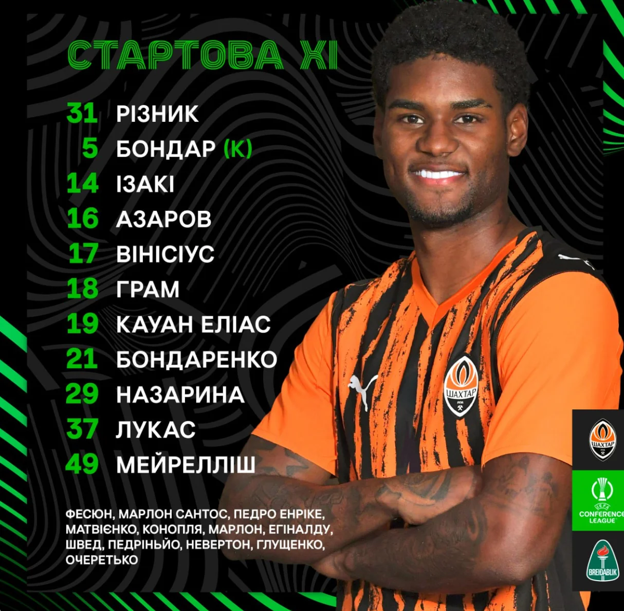 Стартовый состав Шахтера: Резник, Бондарь (к.), Изаки, Азаров, Винисиус, Грам, Кауан Элиас, Бондаренко, Назарина, Лукас, Мейреллиш.