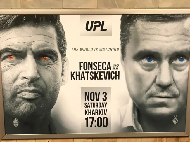 Плакат сделан в стиле UFC, а на афише красуется надпись: "Мир смотрит. Фонсека против Хацкевича". Вместе с тем, по бокам плаката расположены лица главных тренеров Шахтера и Динамо.