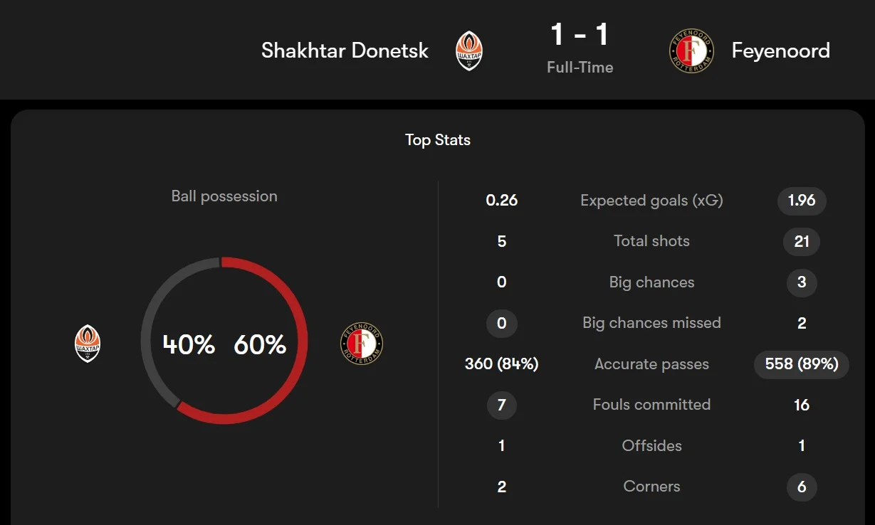 С другой стороны, можете ли вы назвать такую развязку несправедливой? Если быть откровенными, то право на это имеют только болельщиками Фейеноорда. Их команда не должна была выцарапывать ничью в конце игры – она заслужила победить, сделав это уверенно. Шахтер продемонстрировал то, что принято называть характером и горящими глазами. Вот этого подопечным Арне Слота точно не хватило.