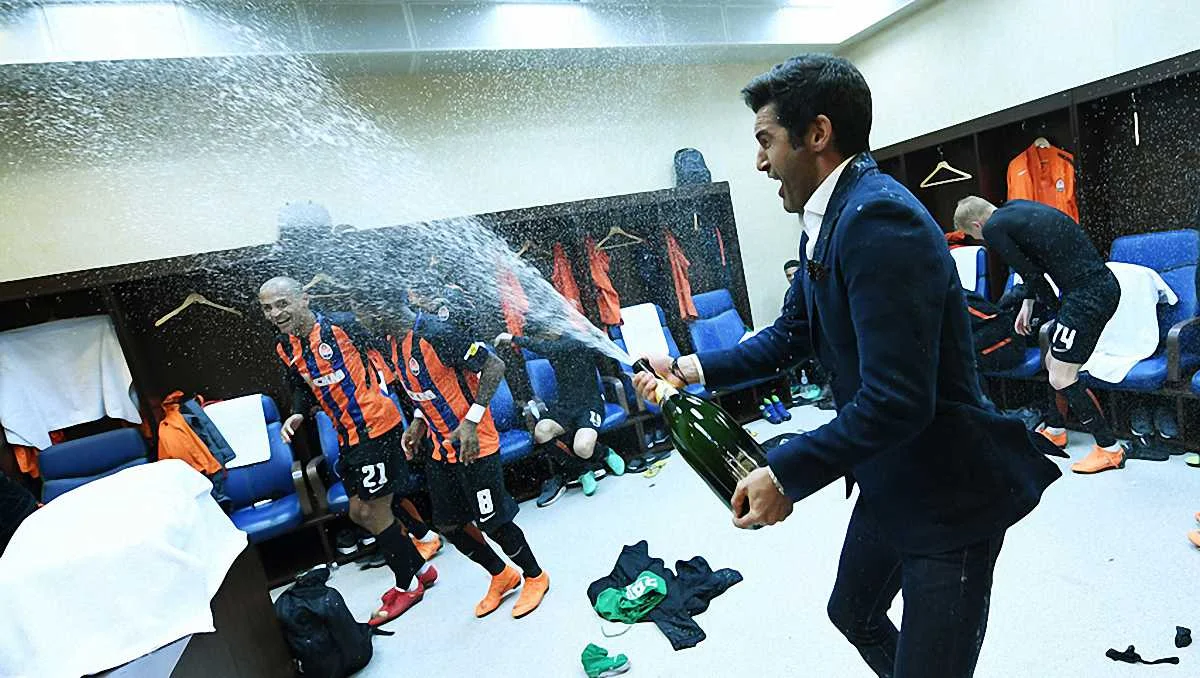 Сначала игроки донецкой команды ворвались на послематчевую пресс-конференцию Паулу Фонсеки и облили португальского специалиста шампанским. А после этого уже тренер Шахтера "отблагодарил" своим подопечным в раздевалке.