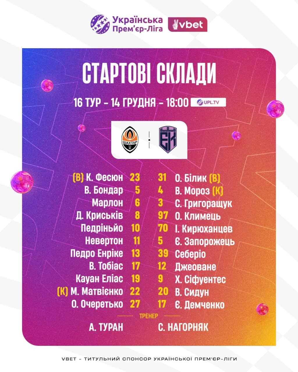 Шахтер: Фесюн – Тобиас, Бондарь, Матвиенко, Педро Энрике – Очеретько, Крыськив, Марлон – Педриньо, Кауан Элиас, Невертон