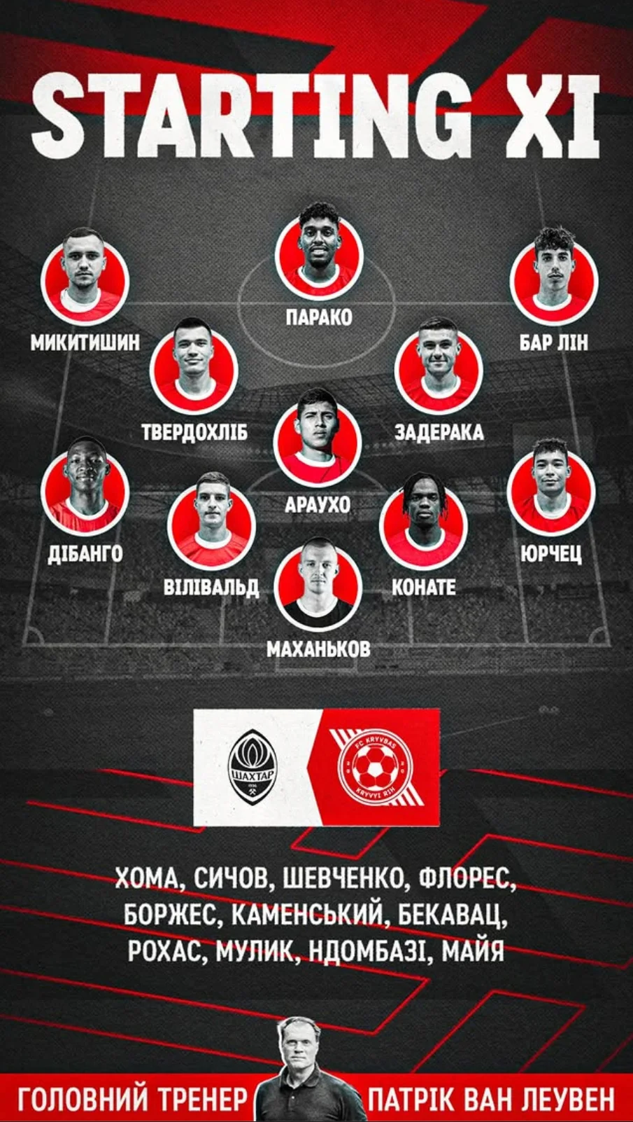 Кривбасс: Маханьков, Конате, Юрчец, Виливальд, Дибанго, Араухо, Задерака, Твердохлеб, Бар Лин, Микитишин, Парако.