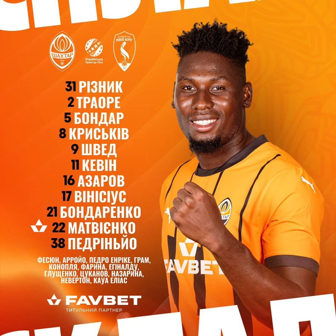 Стартовый состав Шахтера: Ризнык, Винисиус, Бондарь, Матвиенко, Азаров, Крыськив, Бондаренко, Педриньо, Швед, Кевин, Траоре