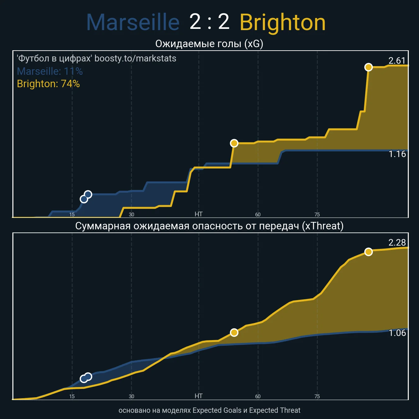 Ныне Марсель находится на восьмой позиции в Лиге 1. Впрочем, кризисность коллектива несколько преувеличена – по ожидаемым голам подопечные Рино держатся в топ-3, а по ожидаемым очкам они вообще вторые после ПСЖ. Не так все плохо и с обороной, ведь только Ницца допустила меньше xG на свои ворота. И особого перебора (то есть фарта или голкиперских подвигов) в этом нет.