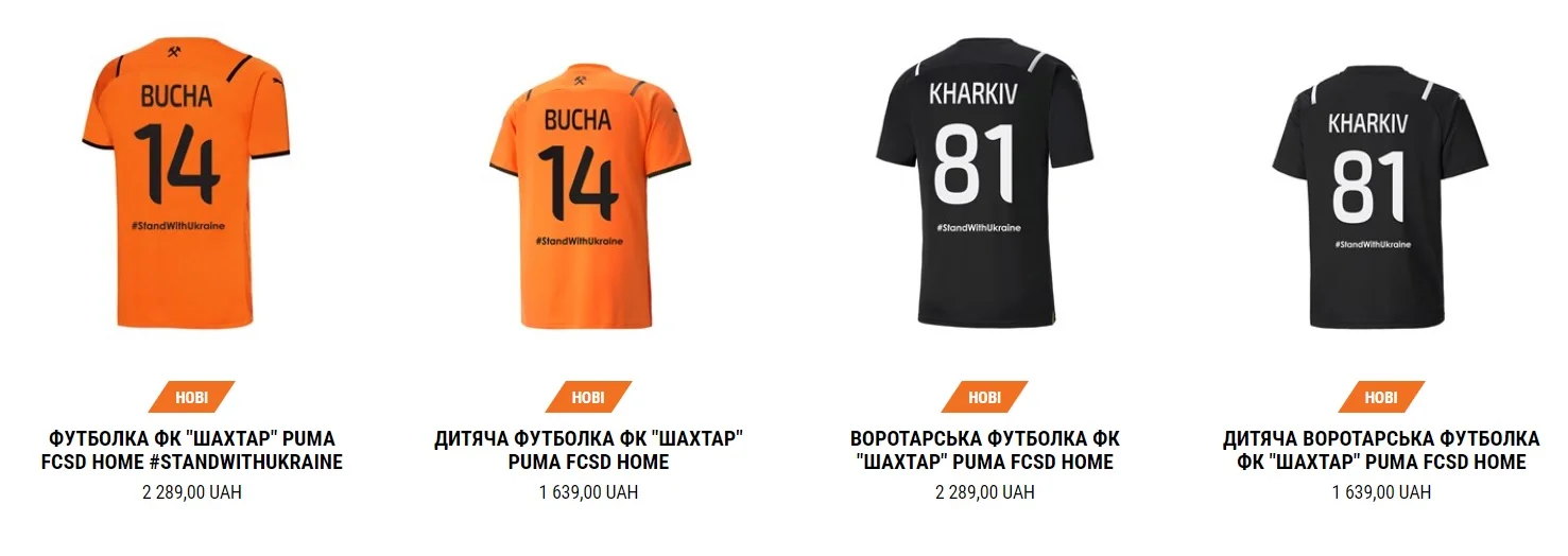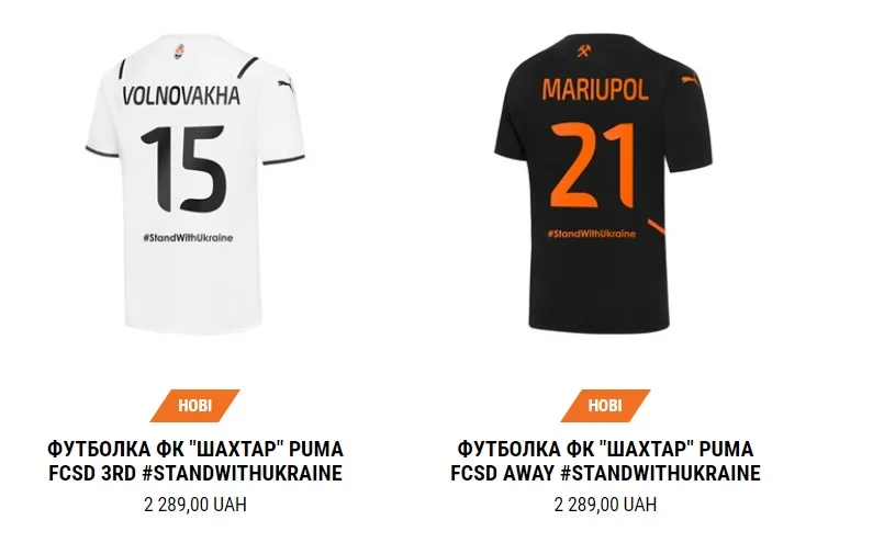 На задней части вместо фамилий игроков появились названия городов-героев Украины – Мариуполь, Буча, Волноваха. В такой форме Шахтер выходил на товарищеский матч против Олимпиакоса. Уникальные футболки выполнят еще одну важную миссию – все средства от продажи пойдут на поддержку детей и переселенцев через благотворительную программу Football for Peace ("Футбол ради мира").