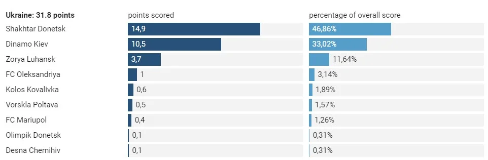 Львиная доля ожидаемо за Шахтером и Динамо – почти 80%. "Горняки" набрали 14,9 очков (46,86%), что заметно больше, чем у извечного конкурента – 10,5 очков (33,02%). Также ощутим вклад Зари (3,7 балла), еще крохи добавили Александрия, Колос, Ворскла, Мариуполь, Олимпик и Десна. Всего за 5 лет Украина пополнила рейтинг на 31,8 очка.