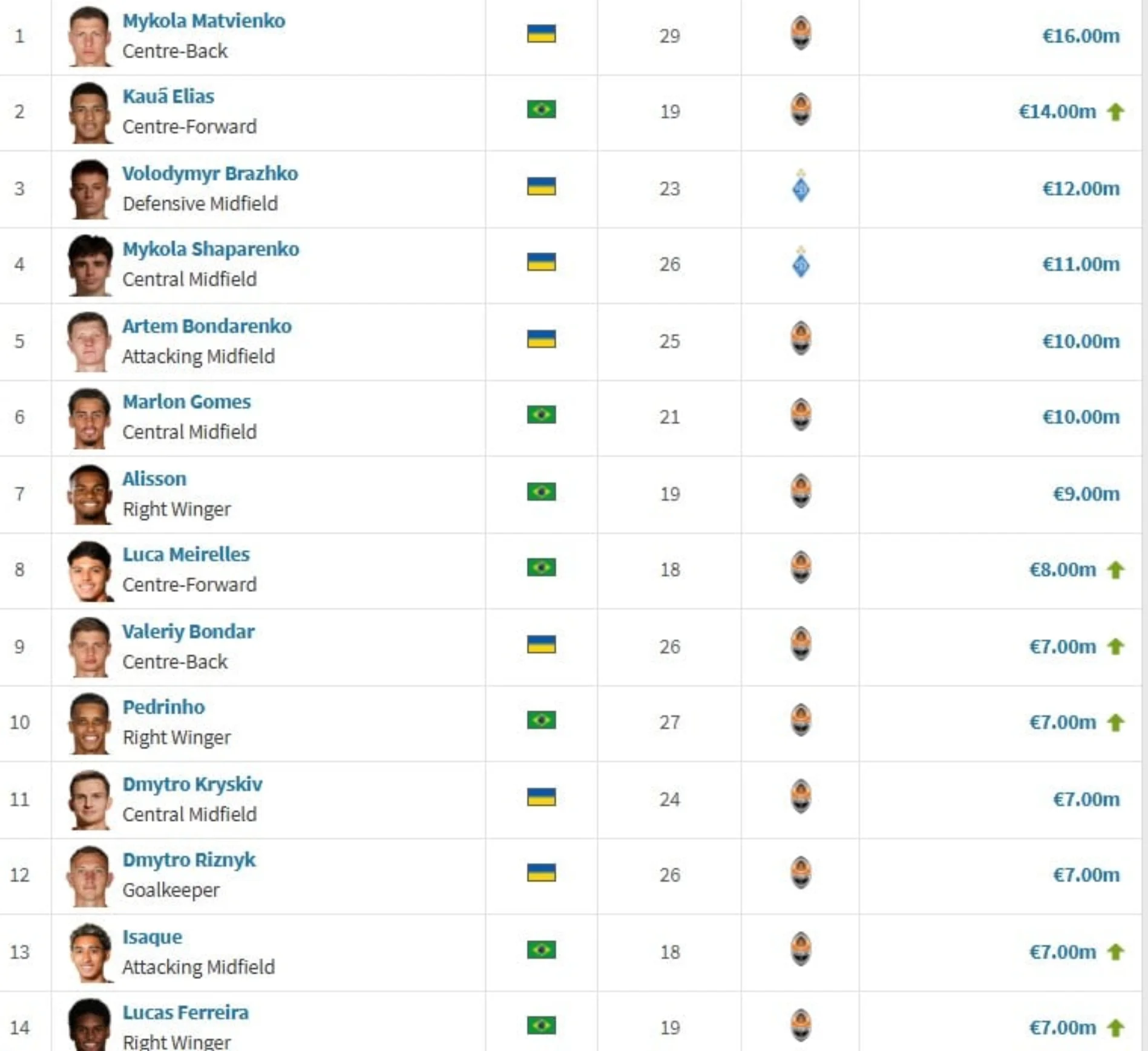 Возглавил рейтинг защитник Шахтера Николай Матвиенко, а на вторую позицию поднялся новичок "горняков" Кауан Элиас, чья стоимость достигла 14 миллионов евро. Также ощутимо выросли цены на Лукаса Мейреллеса, Валерия Бондаря и Педринью, которые тоже вошли в топ-10. До перехода в Бенфику на вершине был Георгий Судаков.