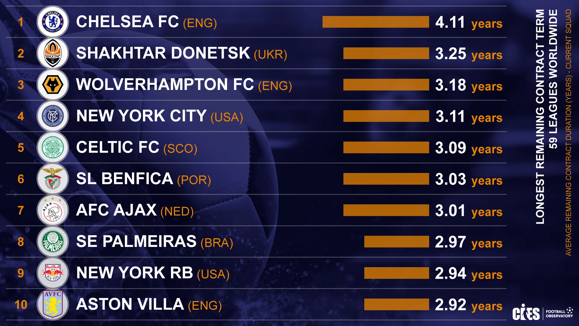 Возглавляет рейтинг лондонский Челси. Однако следует понимать, что для лондонцев такая политика была исключительно инструментом, чтобы обойти требования финансового фэйр-плей. Немало дорогостоящих новичков подписывали контракты на 6-8 лет, что очень повлияло на позицию Челси.