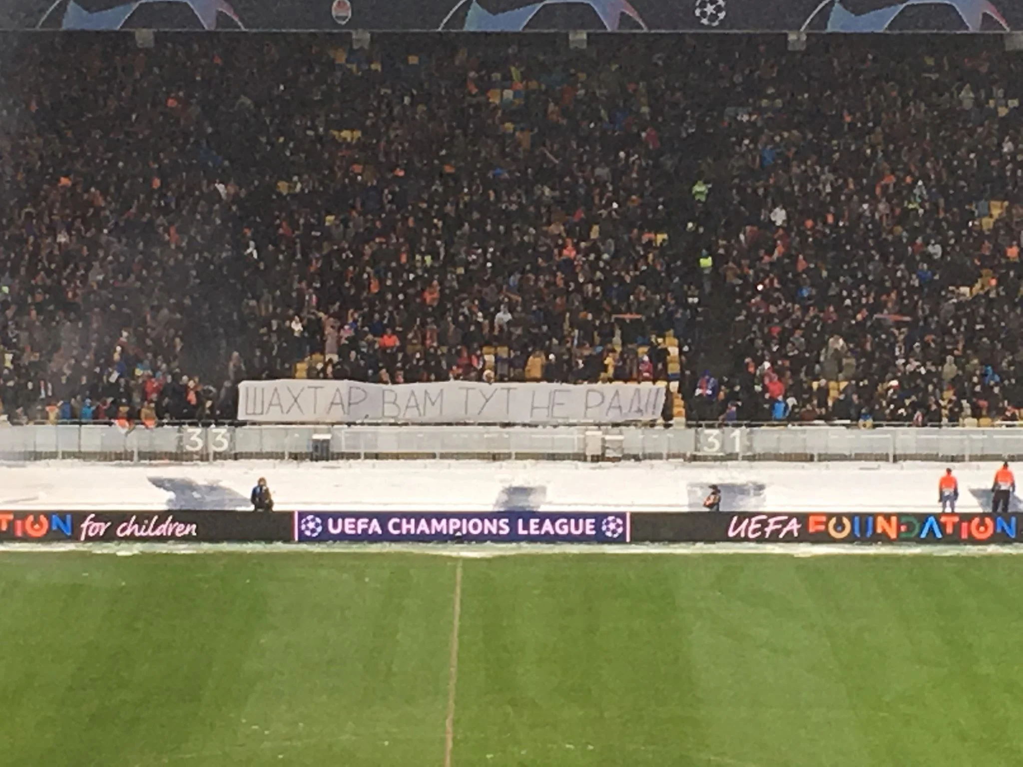 На одном из центральных секторов НСК Олимпийского, где проходит матч Лиги чемпионов между Шахтером и Лионом, был вывешен баннер с текстом: "Шахтер, вам здесь не рады".