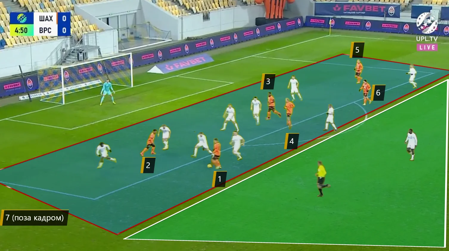 Здесь заметно, что "горняки" уже успели вернуться и получили численное большинство против выбегающей тройки (которая до сих пор за спиной Иеде). Но Самсон тянет мяч, пока не ошибется с передачей.