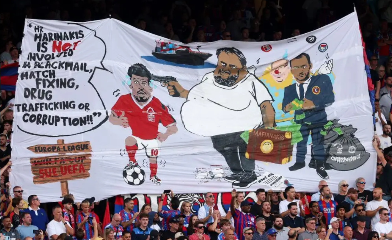 АПЛ открыла расследование из-за баннера болельщиков Кристал Пэлас с провокационным изображением владельца Ноттингем Фореста Эвангелоса Маринакиса.