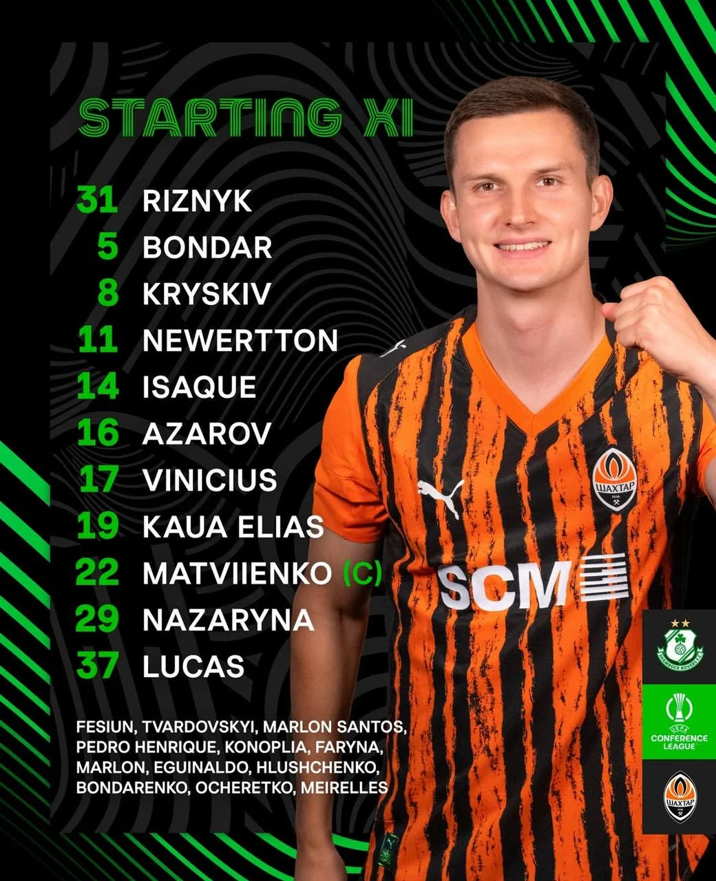 Шахтер: Резник, Бондарь, Крыськив, Невертон, Изаки, Азаров, Тобиас, Кауан Элиас, Назарина, Матвиенко (к), Лукас Феррейра