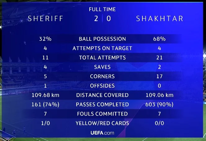 Шериф был лучше, свежее, атлетичнее, боевитее и организованнее. Безумие и парадокс, но чемпион Молдовы был даже техничнее бразильского легиона гостей (69% успешности дриблинга против 54%). Больше хотел, лучше умел. Мяч быстро двигался, никто не тормозил темп атак, команда выглядела единым целым во все стадиях игры. Даже когда футболисты Шахтера пробивали из пределов штрафной, у них было гораздо больше опеки, чем в аналогичных эпизодах у ворот Пятова.