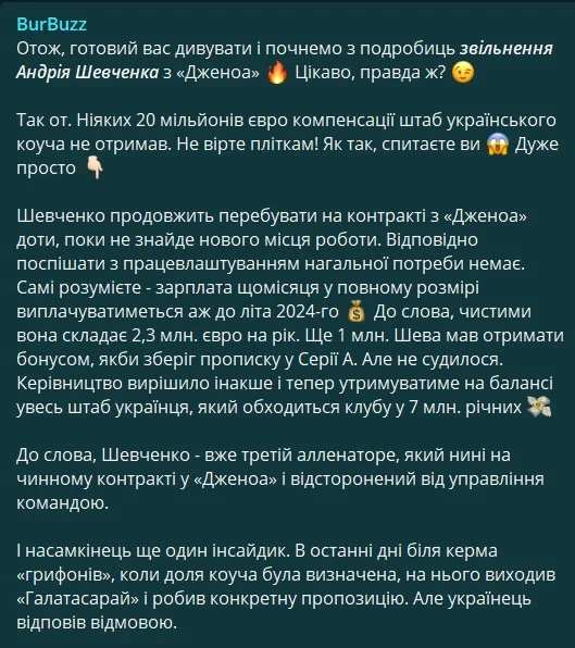 Андрей Шевченко получил предложение от Галатасарая в последние дни работы в Дженоа, утверждает журналист Игорь Бурбас в своем Telegram-канале.
