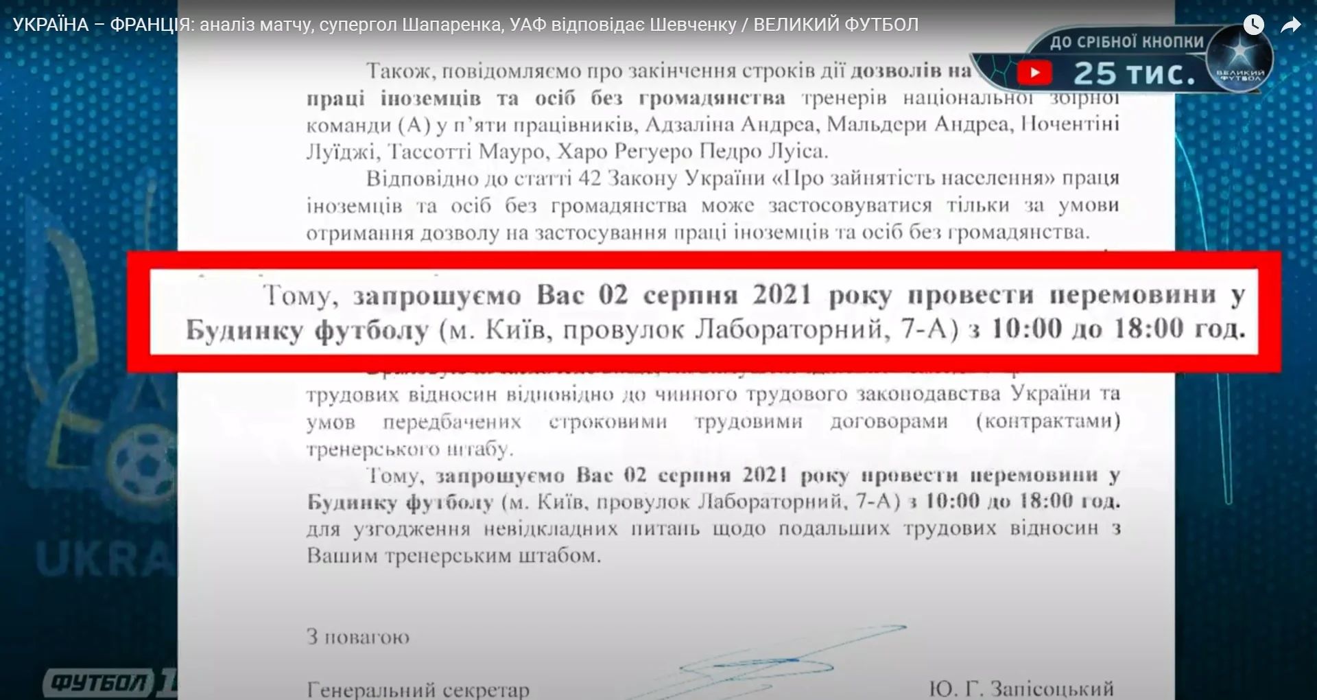 Скриншот приглашения Шевченко от УАФ, продемонстрированный в эфире Великого футболу: