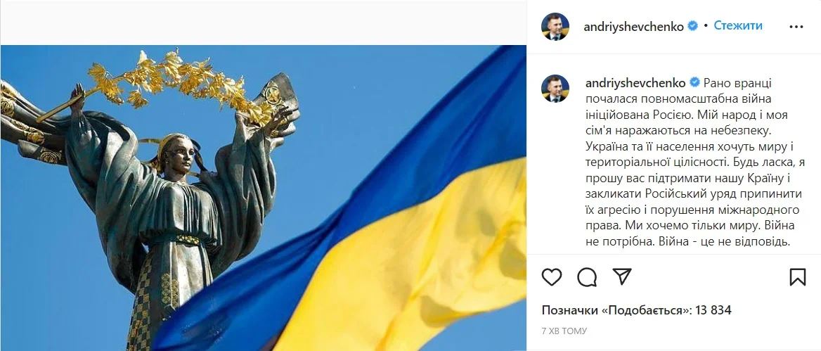 Пожалуйста, я прошу вас поддержать нашу страну и призвать Российское правительство прекратить их агрессию и нарушение международного права. Мы хотим только мира. Война не нужна. Война – это не ответ", – написал Шевченко в Instagram.