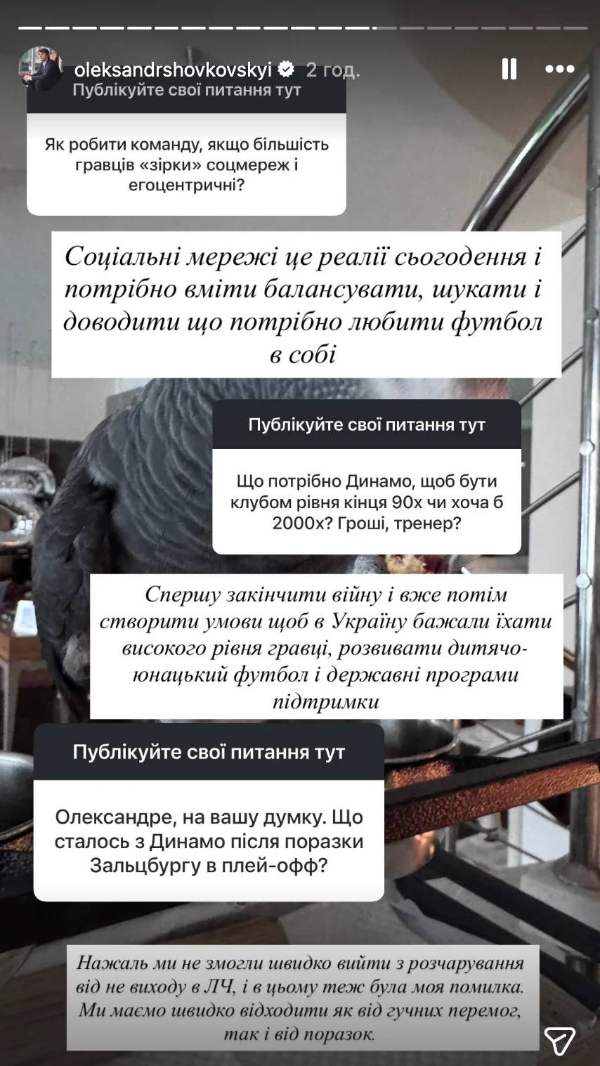 Бывший вратарь и тренер Динамо Александр Шовковский пообщался с болельщиками в Instagram, где ответил на вопросы относительно современных футболистов, перспектив киевского клуба и причин спада команды после неудачи в еврокубках.