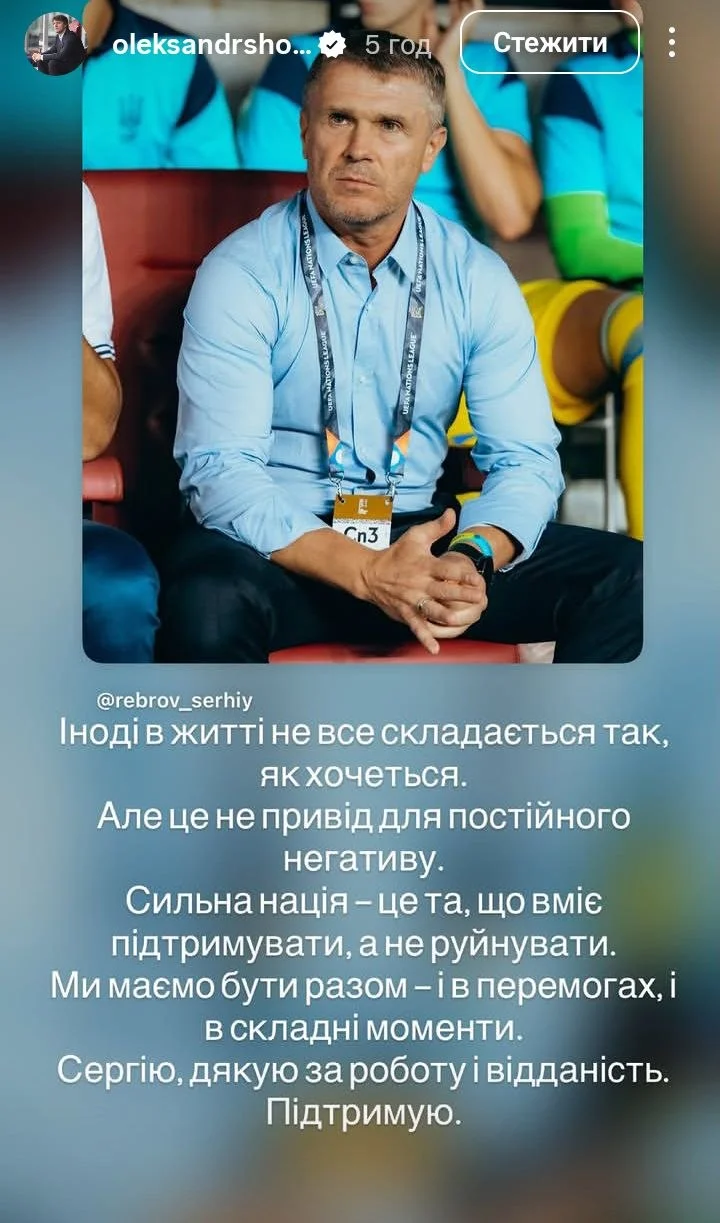 "Иногда в жизни не все складывается так, как хочется. Но это не повод для постоянного негатива. Сильная нация – это та, что умеет поддерживать, а не разрушать. Мы должны быть вместе – и в победах, и в сложные моменты. Сергею, спасибо за работу и преданность. Поддерживаю", – написал Шовковский в своем Instagram.