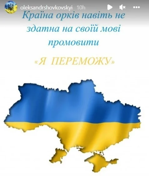"Страна орков даже не способна на своем языке произнести: "Я переможу", – написал Шовковский в Instagram, прикрепив карту Украины в сине-желтых цветах.