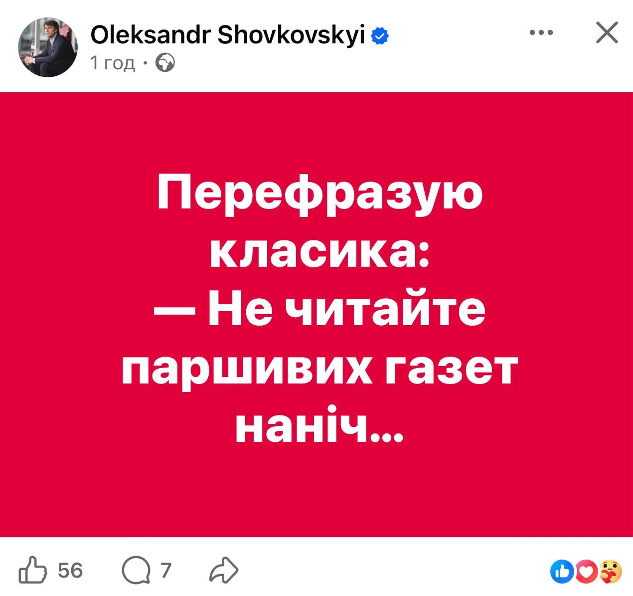 "Перефразирую классика: – Не читайте паршивых газет на ночь", – написал Шовковский.