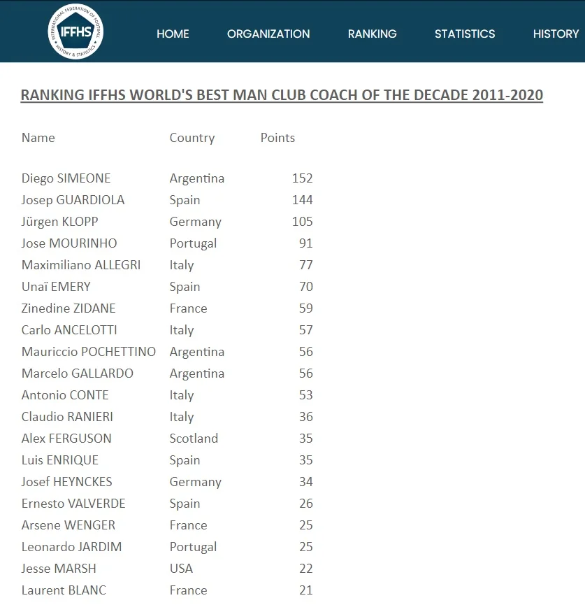 Международная федерация футбольной истории и статистики (IFFHS) определила лучших клубных тренеров за последние 10 лет.