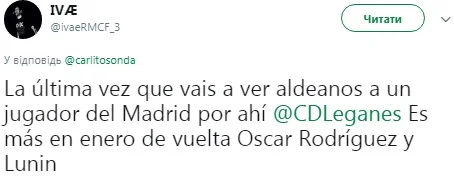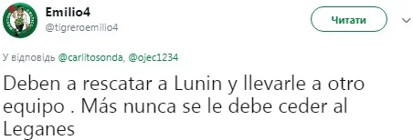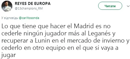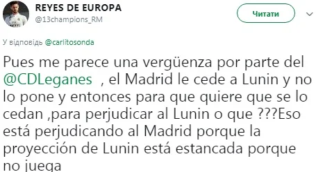 Тот же фанат Реала потом добавил: "Мне кажется, что Леганес ведет себя позорно в ситуации с Луниным. Мадрид отдал им футболиста, чтобы он не играл ... Для чего это делается? Чтобы навредить Лунину? Страдает сейчас Реал, потому что карьера игрока переживает застой ".