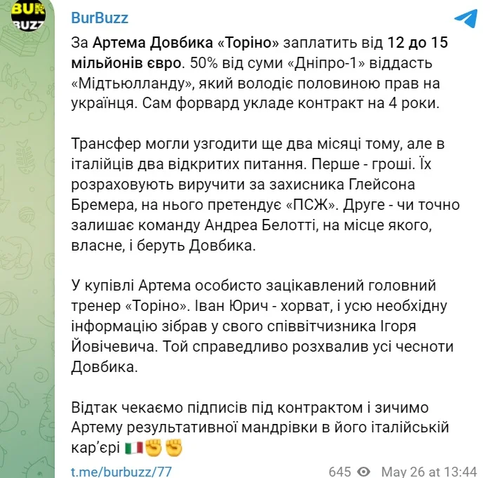 "За Артема Довбика Торино заплатит от 12 до 15 миллионов евро. 50% от суммы СК Днепр-1 отдаст Митьюлланду, владеющему половиной прав на украинца. Сам форвард заключит контракт на 4 года.