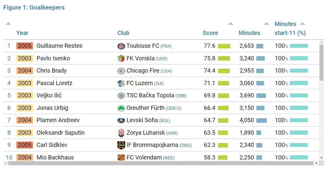 Согласно ей, рейтинг возглавил вратарь Тулузы Гийом Рест, набравший 77,6 балла. Вторую строчку оккупировал Исенко с оценкой 75,8. Замкнул топ-3 голкипер Чикаго Файр Кристофер Брэйди (74,4). Сапутин занял восьмую строчку, набрав 63,5 балла.