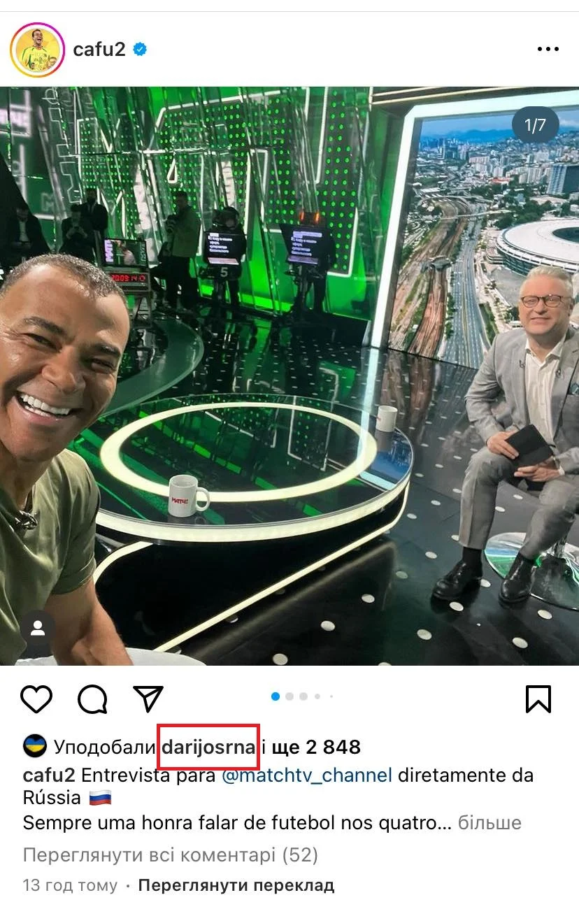 На запрос Футбол 24 в клубе ответили, что Дарио уже убрал свой лайк под публикацией, контекст которой не понял. Он не увидел, о чем идет речь в посте Кафу, и очень разочарован поступком бразильца, принявшего участие в шоу на российском ТВ.